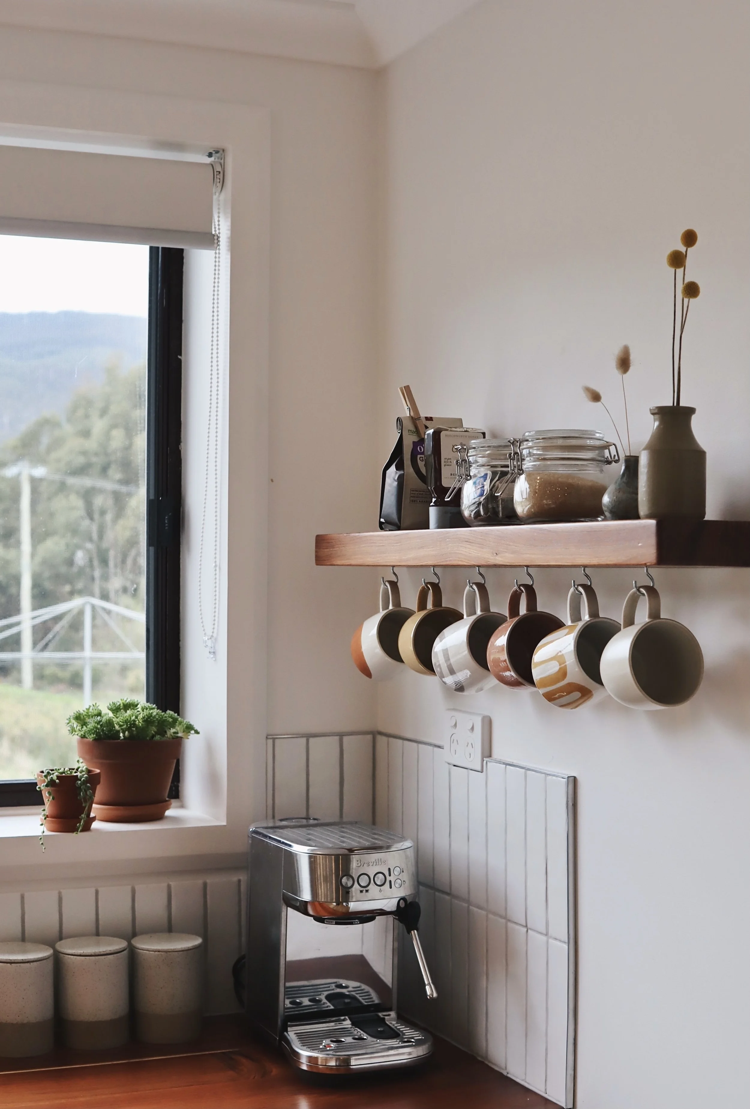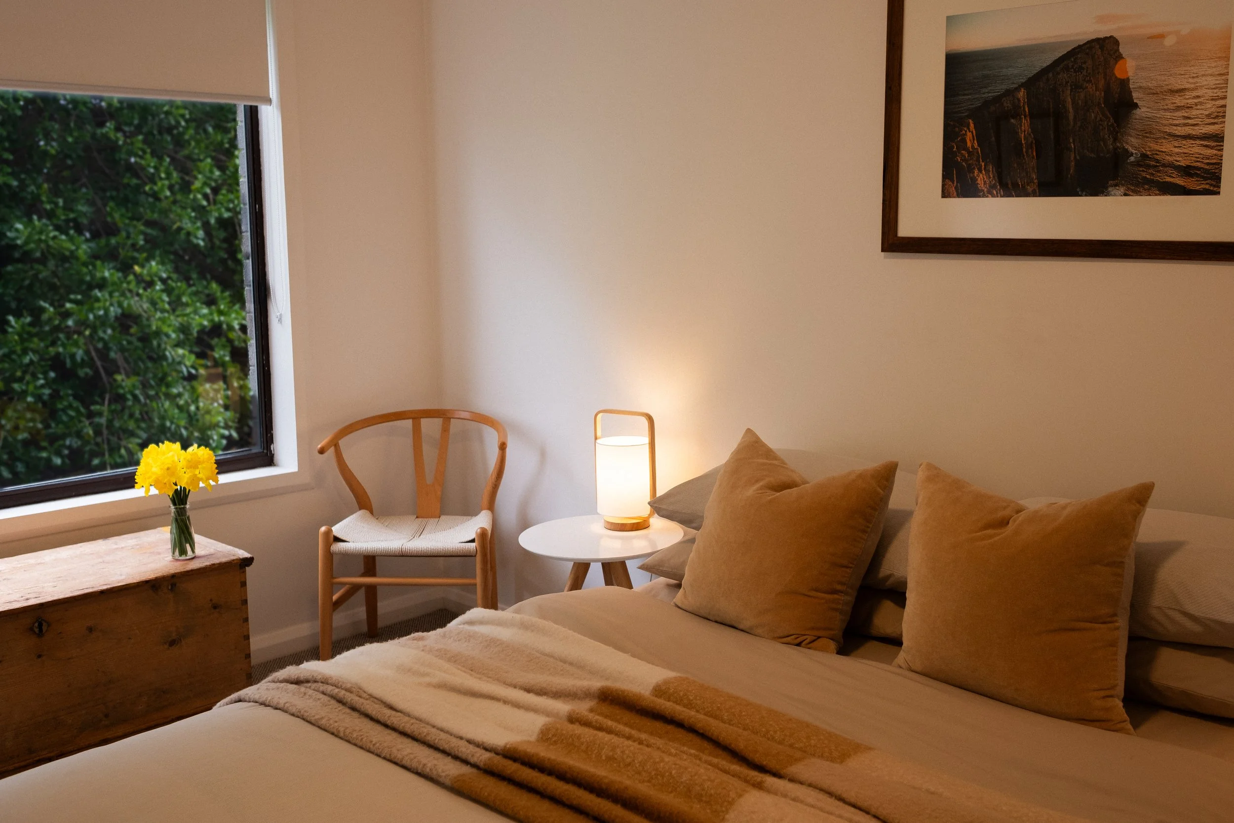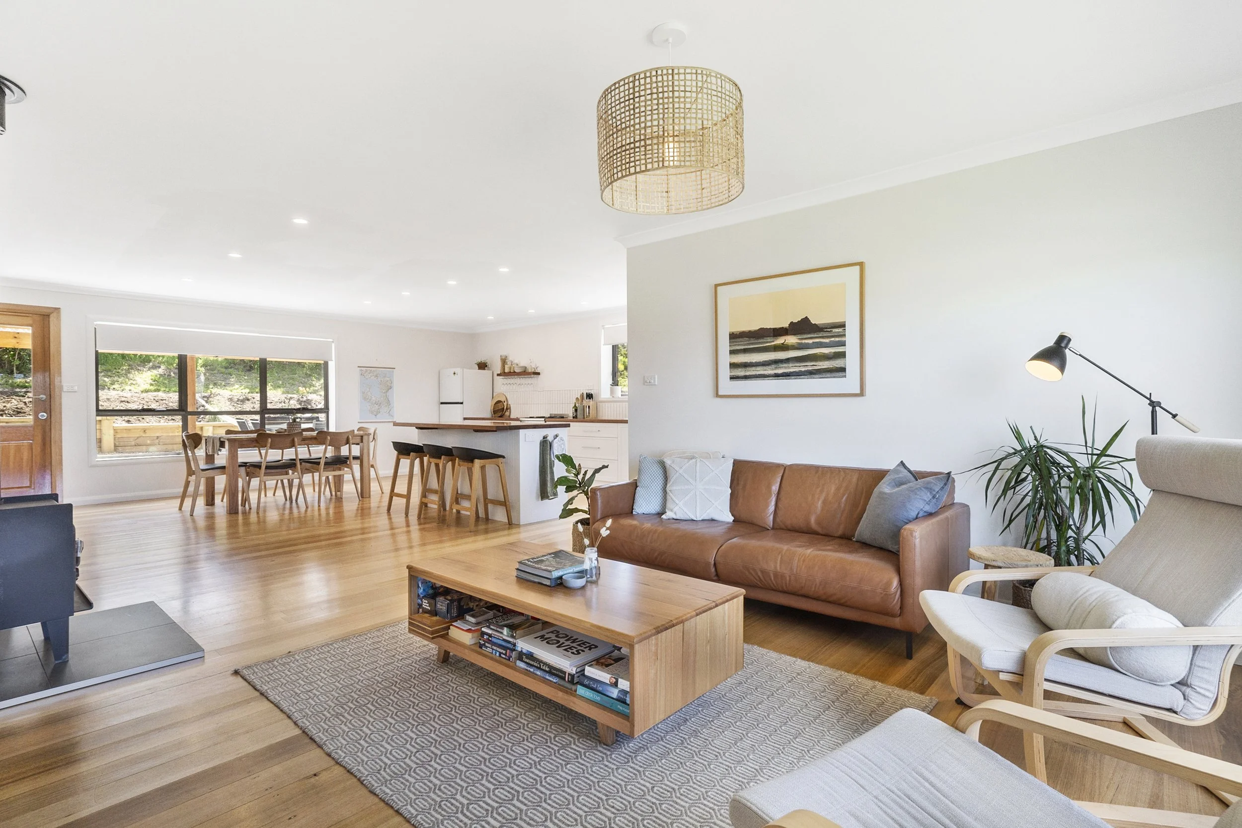 A bright open-plan living area with a fully equipped kitchen, boastingTassie blackwood bench-tops. We provide complimentary tea, coffee & espresso grind for our coffee machine to enjoy your morning brew by the fire or outside in the sun. Other essential inclusions include oil, salt & pepper.